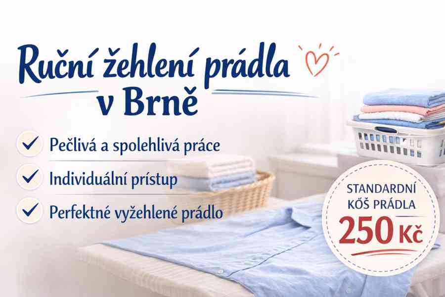 Nabízím ruční žehlení prádla pro soukromé osoby v Brně. Postarám se o veškeré běžné prádlo – od oblečení přes ložní prádlo až po košile. Zakládám si na pečlivosti, spolehlivosti a individuálním přístupu ke každému zákazníkovi. Mým cílem je vždy perfektně vyžehlené prádlo a maximální spokojenost klienta. Cena standardní koš prádla 250 Kč. V případě zájmu mě neváhejte kontaktovat. Ráda se s vámi domluvím na detailech.