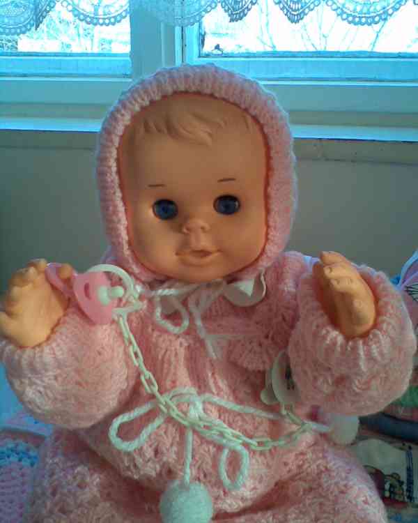jako nová mrkací, plačící, čistá panenka PC 1100,- v novém oblečení, botičky, deka, sada s nočníkem, lahvičky jedna s bonbonky zdarma a druhá nová mluvicí, chrastítko, dudlík na řetízku, možno přidat hromádku nového oblečení na převlékání 500,-