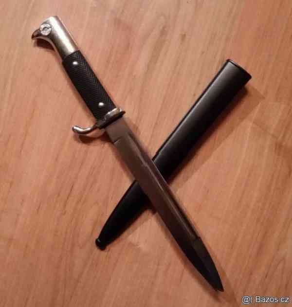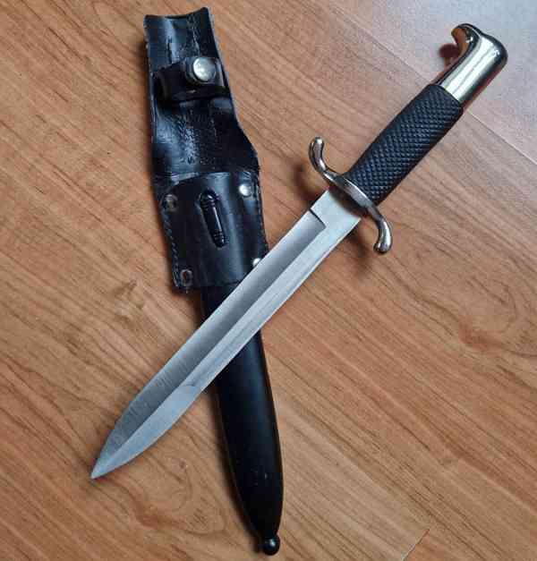 Prodám sběratelům tento úplně nový německý druhoválečný vycházkový policejní bodák.Pouzdro potažené koženkou.Jedná se o moc pěknou repliku tohoto bodáku,která určitě ve sbírce každého sběratele válečných militárií ostudu neudělá.Vzhledem k vysokým cenám originálů,je tato replika dobrá volba.Celková délka je asi 47 cm.