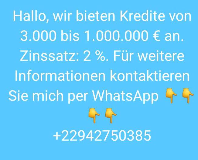 Hallo, wir bieten Kredite von 3.000 bis 1.000.000 € an. Zinssatz: 2 %. Für weitere Informationen kontaktieren Sie mich per