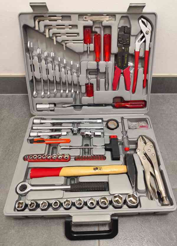 Pevný kufr ukrývá desítky praktických nástrojů uspořádaných přehledně tak, aby práce byla rychlá a efektivní. Od šroubováků a kleští, přes ráčnu s hlavicemi, bity a šroubovák na bity s T rukojetí , ploché obvoustranné klíče, kladivo, sada imbusů, zkoušečka na elktřinu atd. Rozměry kufříku 43 x 33 x 9,5 cm, obsah 65 dílů nářadí. Celkově v perfektním stavu, jen dvakrát použitý, viz fota, původní cena 1.628,-Kč, prodám nyní za 1.228,-Kč.