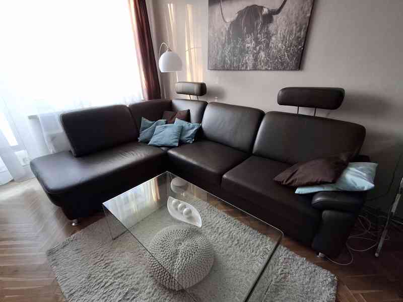 Prodám koženou sedací soupravu, tmavě hnědá, rozměry 200 x 263 cm, výška sedu 40 cm, 2 nastavitelné a odnímatelné hlavové opěrky, nohy chrom. Výroba SRN.