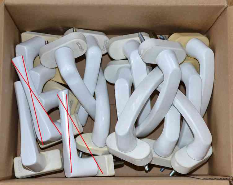 Hliníkové kliky bílé barvy kompatibilní s většinu běžných plastových oken a dveří. K dispozici celkem 13 kusů (2 kusy dle fotek 2+3+4, 4 kusy dle fotek 5+6, 6 kusů dle fotek 7+8, 1 kus dle fotek 9+10) včetně šroubů, univerzální rozměry: čtyřhran 7x7 mm, délka trnu minimálně 35 mm, rozteč otvorů šroubů 43 mm, různé tvary klik viz foto. Vše kvalitní značkové např. HOCO atd. - jde o starší typy, které již běžně neseženete. Jsou ideální pro opravu stávajících oken a dveří bez narušení jednotného vzhledu klik potřebujete-li některý z tvarů klik co mám. Cena 49 Kč/ks (případná dohoda podle počtu a stavu odebraných kusů možná).